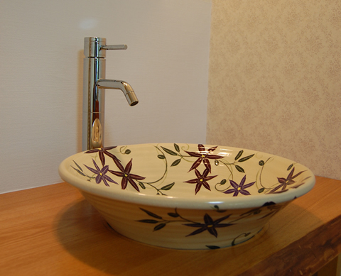 和洋室ツインの和洋室ダブルの蘭(らん)・洋室ダブルのルピナス・2階の12畳和室のかつらのお部屋の洗面器は風情ある信楽焼です。